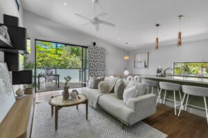The upper level is stylishly appointed with timber floors and high ceilings, providing ample living and dining space. The level opens out to a spacious front deck, with a tranquil leafy outlook and privacy screening enjoying a perfect setting for family dinners or entertaining guests. The modern kitchen consists of an island bench for casual meals, walk-in pantry, stone benchtops and quality stainless steel appliances including gas hot plates, electric oven and dishwasher, which are all framed by a clear glass splash back shaded by tall palm trees.