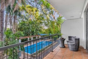 • Covered balcony with a leafy green aspect overlooking the complex pool
