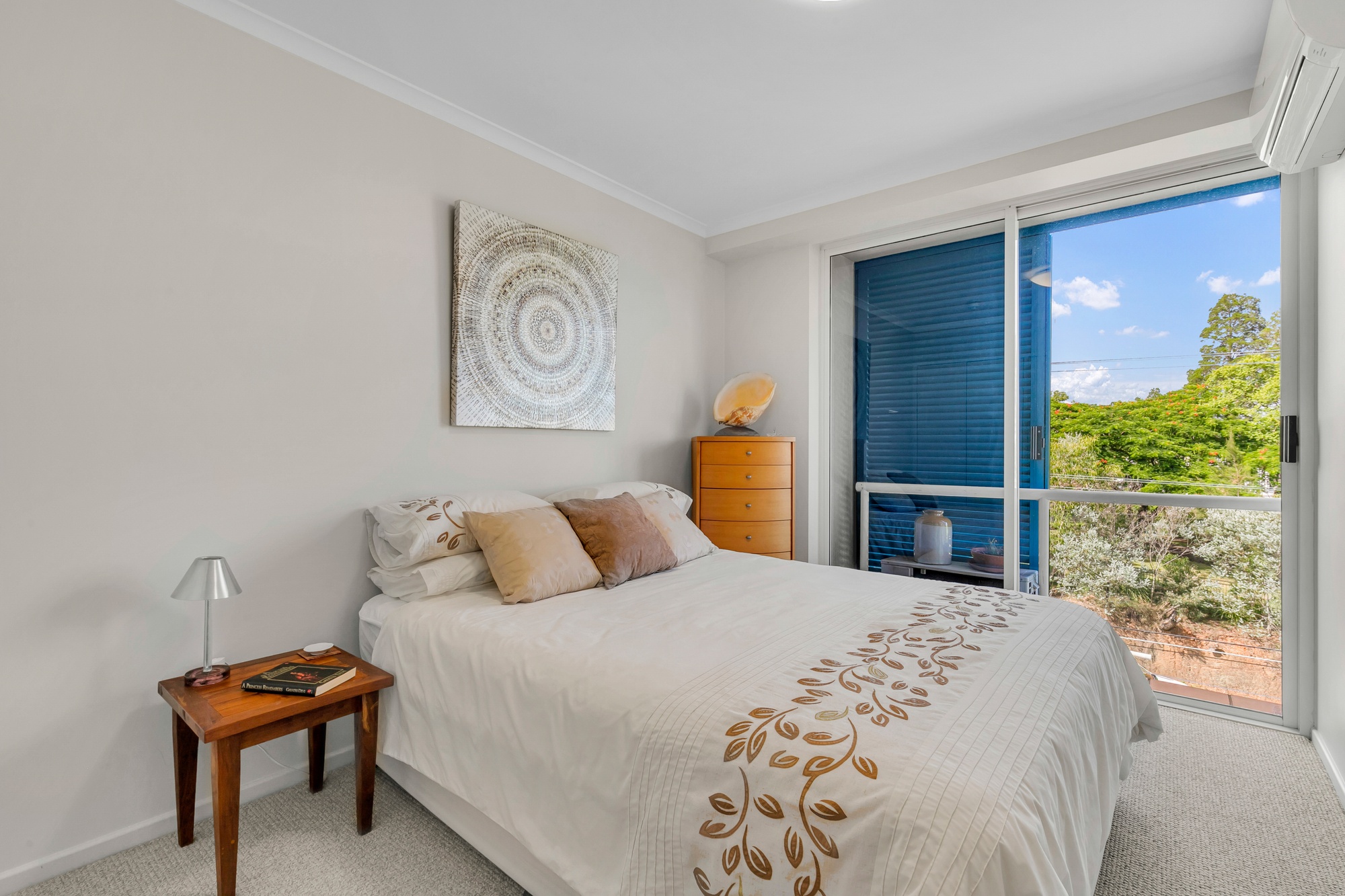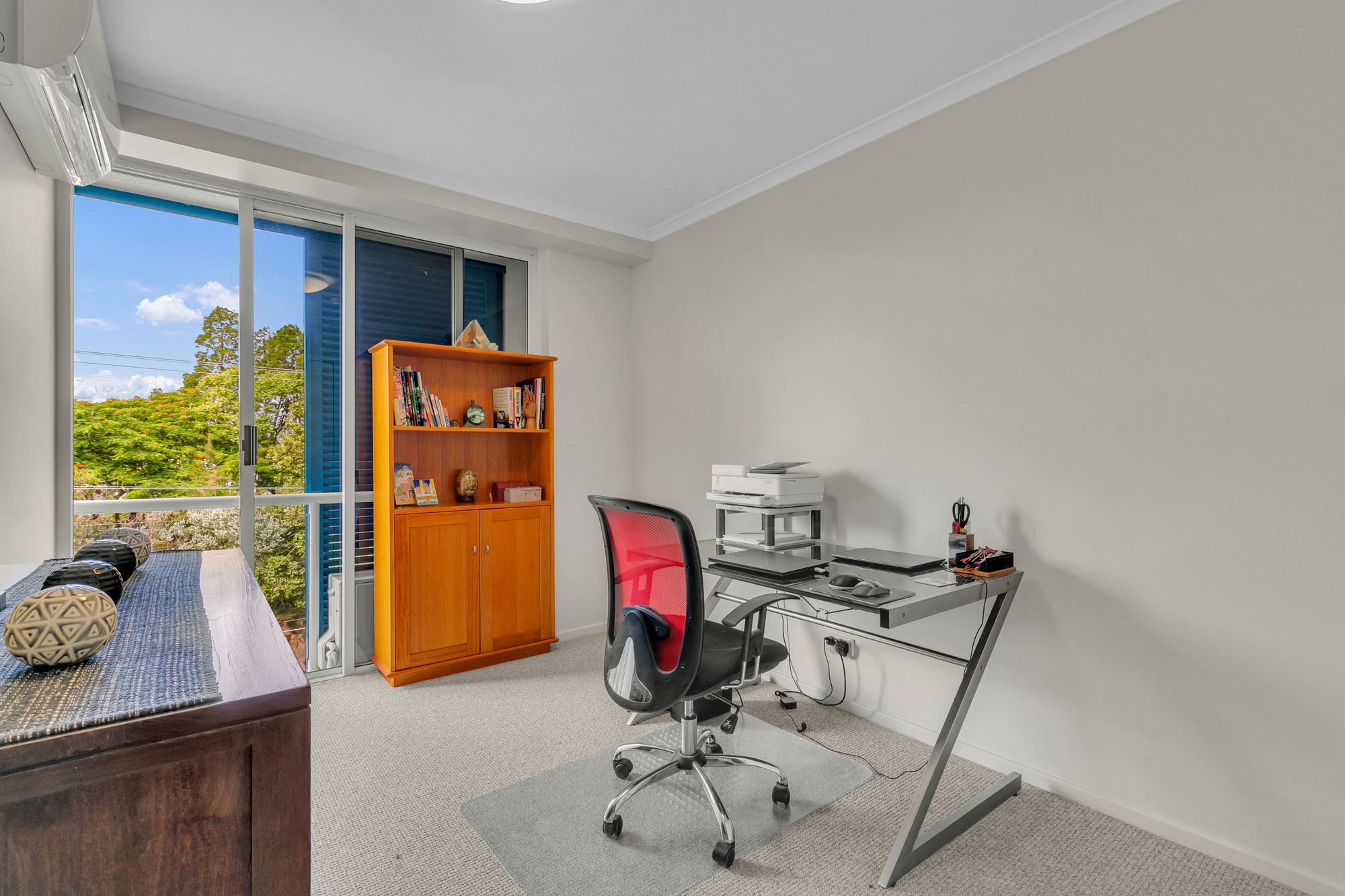 Comfort continues with three bedrooms, each equipped for modern living. The main bedroom includes a Mitsubishi air-conditioner, while bedrooms two and three both feature Panasonic split systems, ensuring year-round climate control for all.