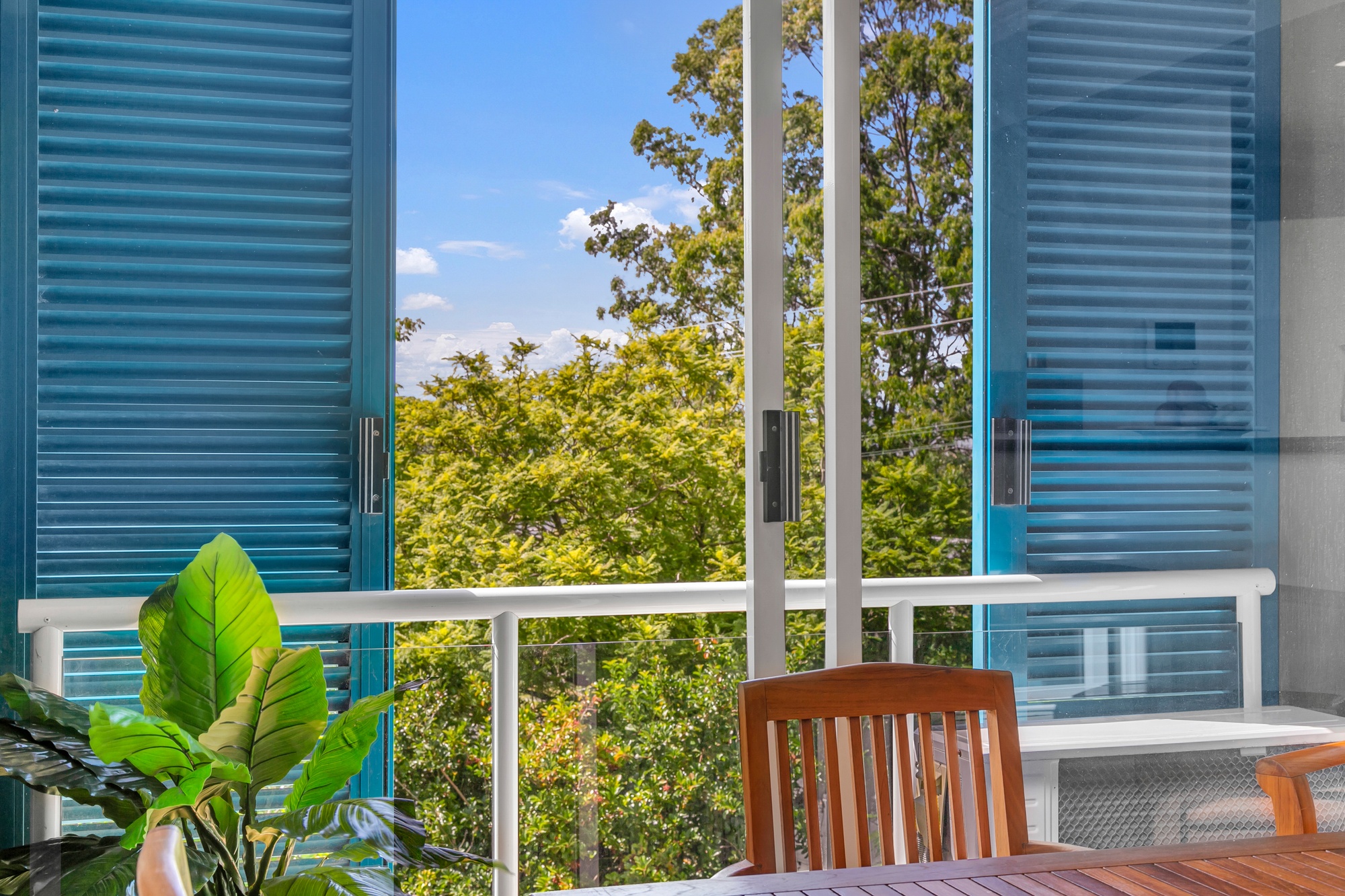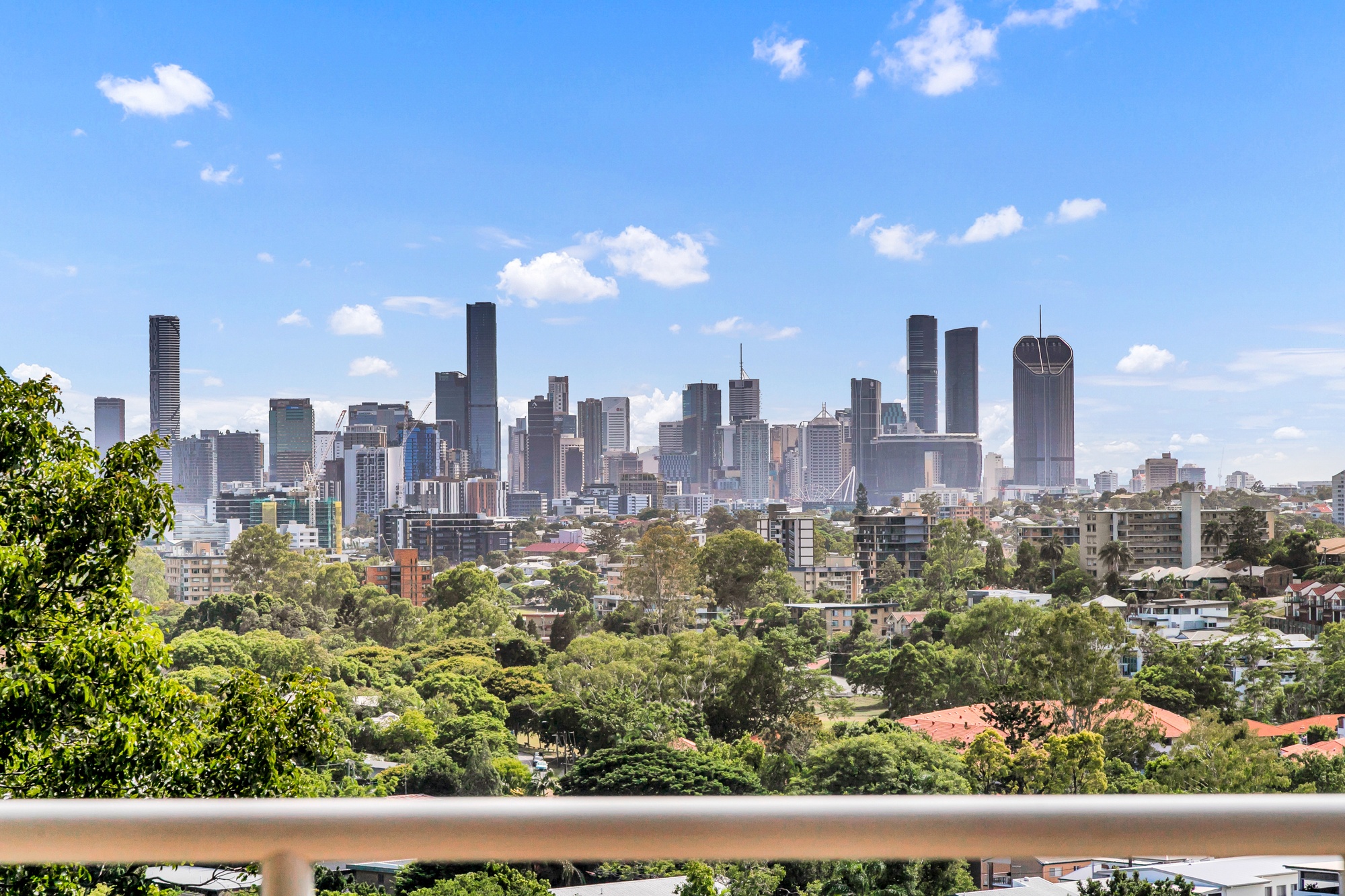 The spacious living and dining area connects seamlessly to your private balcony — its leafy outlook and sweeping city views creating the perfect space to unwind or entertain guests as the sun sets over Brisbane.