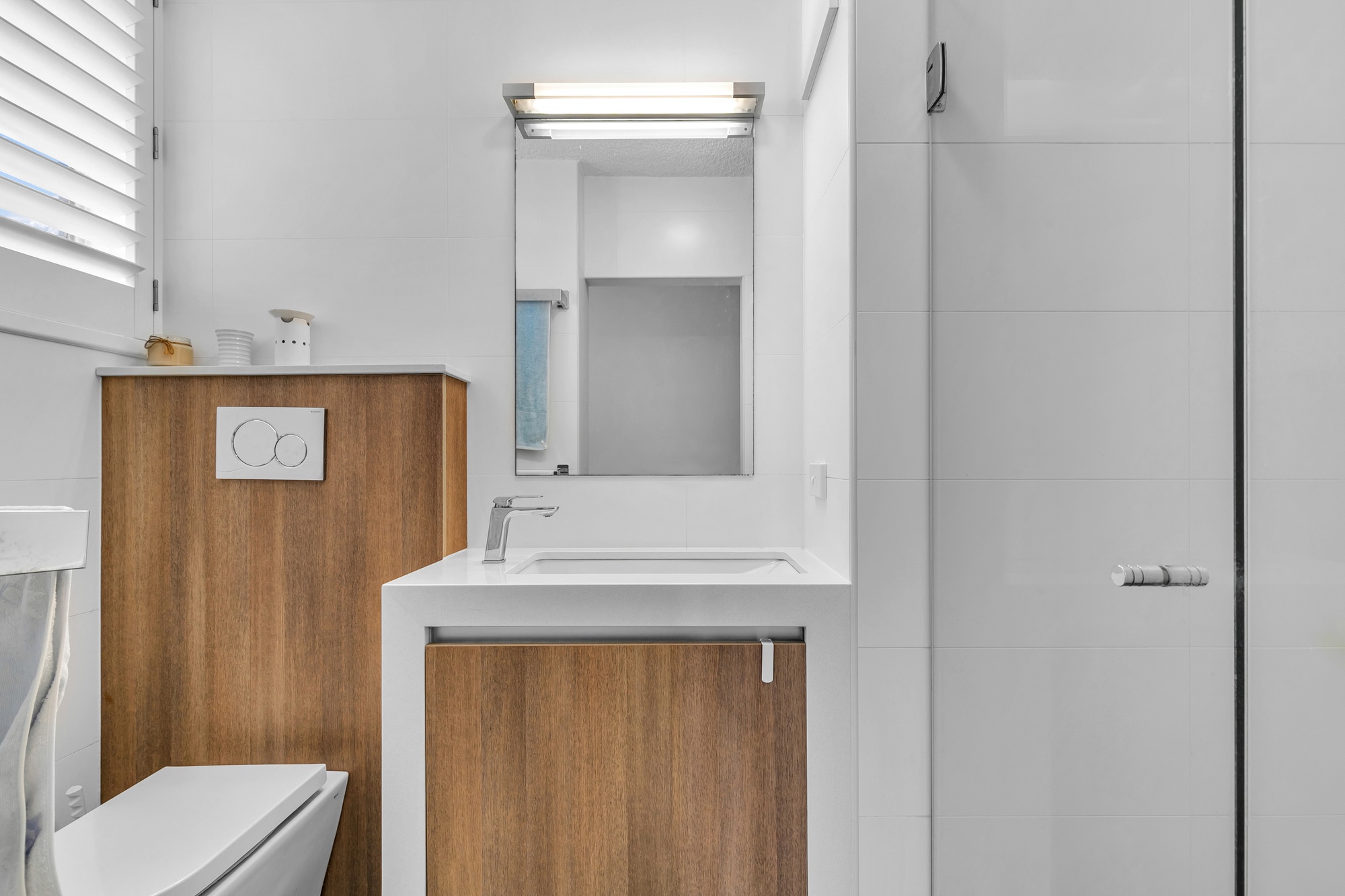 • Main bathroom services the second &third bedrooms, also containing a sizeable walk-in shower &elongated mirrored vanity with timber-look cabinetry