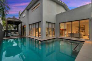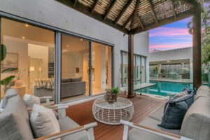 The open plan design features stunning oversized living zones, all centrally located overlooking a stunning inground saltwater pool with a Balinese pavilion and entertaining areas.